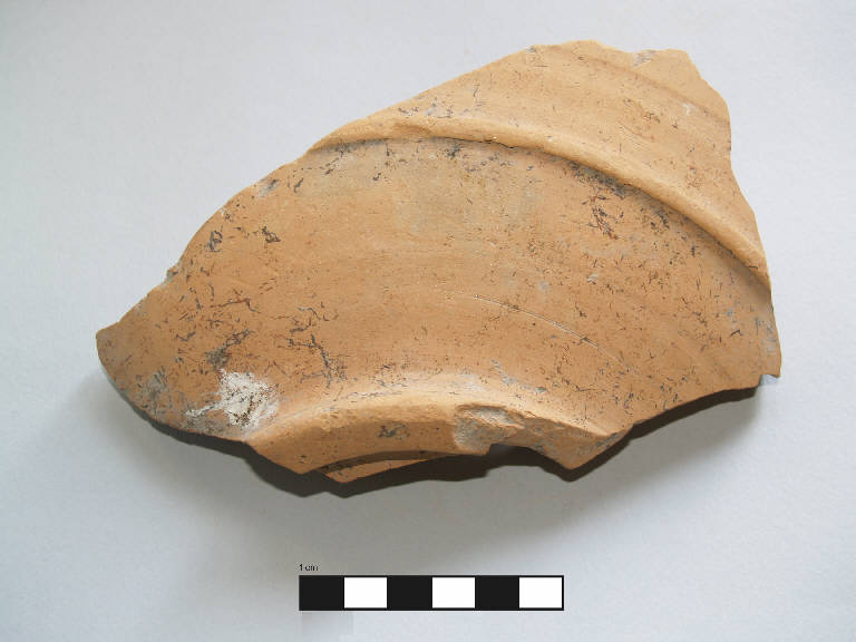 Parete decorata+piede di mortaio.\nVasca troncoconica profonda, piede ad anello svasato con base appiattita; un cordone orizzontale 5,3 cm ca. al di sopra del piede; grani minerali sulla superficie interna. \nCorpo ceramico compatto, con superficie farinosa, con depurazione buona, assenza di inclusi. Colore nucleo: giallo-rosato; sup. esterna: giallo-rosato; sup. interna: giallo-rosato.