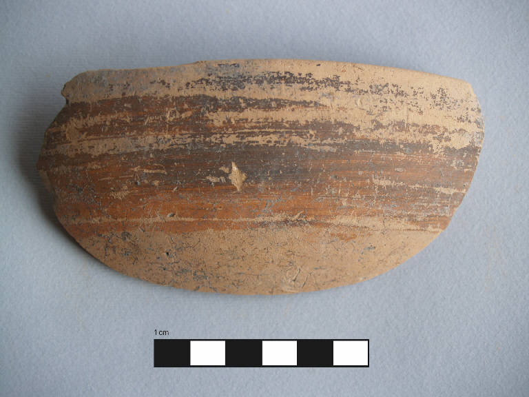 Orlo+parete di ciotola. \nOrlo piatto leggermente arrotondato, labbro verticale a profilo curvilineo, vasca a calotta mediamente profonda.\nCorpo ceramico compatto, con superficie farinosa, con depurazione buona, assenza di inclusi. Colore nucleo: giallo-rosato; sup. esterna: giallo-rosato, una banda dipinta di colore bruno nella parte superiore; sup. interna: dipinta di bruno.