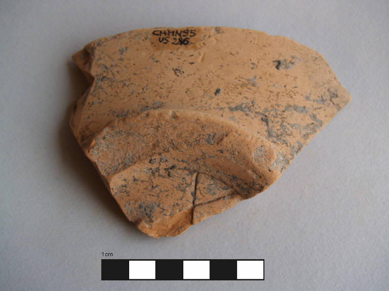 Parete+piede di mortaio.\nAttacco di vasca, piede ad anello svasato; grani minerali sulla superficie interna; segni incici sul fondo esterno.\nCorpo ceramico poco compatto, con superficie farinosa, con depurazione buona, assenza di inclusi. Colore nucleo: giallo-rosato; sup. esterna: giallo-rosato; sup. interna: giallo-rosato.