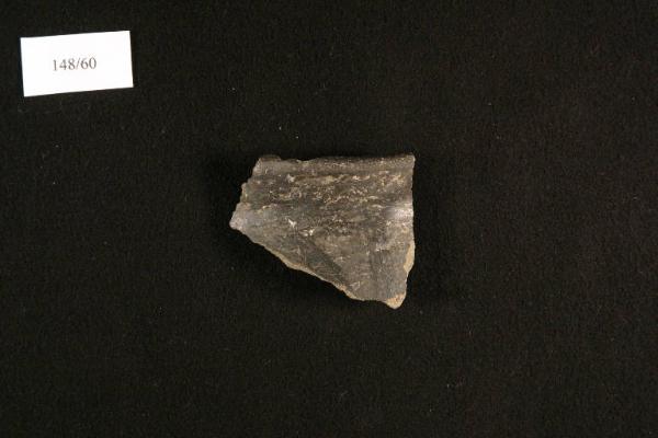 orlo piatto, labbro leggermente estroflesso a profilo rettilineo, spalla sfuggente; fascia sull'orlo a stralucido e composizione geometrica a bande a stralucido sulla parete.