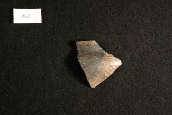 orlo piatto, labbro leggermente estroflesso a profilo rettilineo,vasca troncoconica a profilo leggermente curvilineo profonda; fascia verticale con sottili linee oblique sulla vasca.