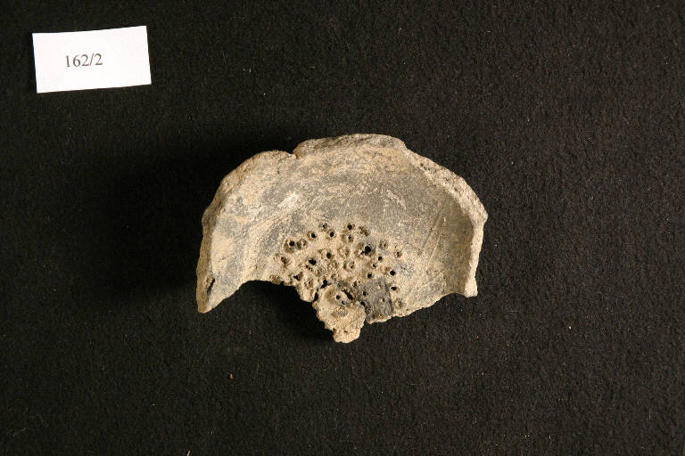 fondo piano con piccoli fori distribuiti a cerchi concentrici, attacco della parete a profilo rettilineo.