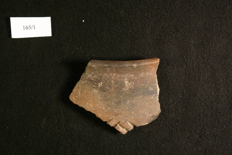 orlo piatto, labbro leggermente estroflesso a profilo curvilineo, spalla sfuggente, corpo ovoide; profonde incisioni a zig zag doppio sulla spalla.