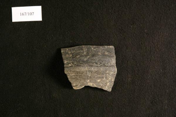 orlo piatto, labbro verticale a profilo rettilineo, carena accentuata, due leggere scanalature orizzontali sul labbro