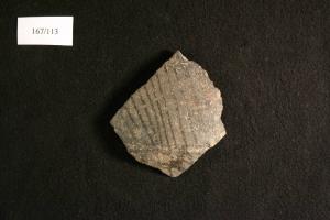 parete a profilo legg. curvilineo con spigolo netto; sottili linee legg. oblique nella parte inferiore, probabili bande in composizione geometrica in quella superiore, eseguite a stralucido