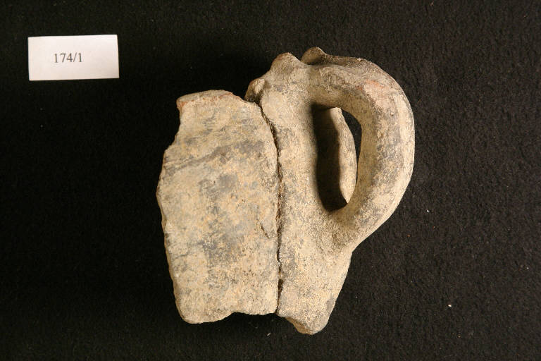 orlo obliquo verso l'esterno, labbro leggermente estroflesso a profilo curvilineo, distinto alla base,vasca troncoconica profonda, ansa a nastro verticale leggermente insellata; due apofisi sull'orlo in corrispondenza dell'attaccatura superiore dell'ansa.