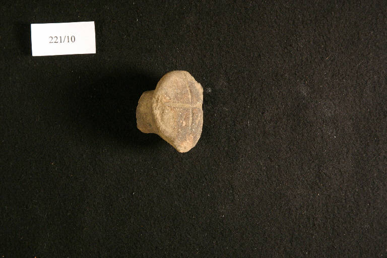 frammento di rocchetto a base espansa leggermente convessa; croce incisa sulla base.