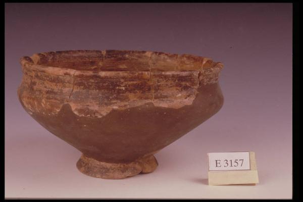 Ciotola a corpo troncoconico, basso piede, tre scanalature sul labbro.