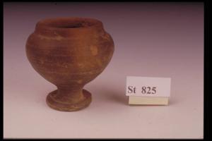 Bicchiere a calice con labbro verticale rientrante rispetto alla spalla arrotondata, breve stelo e piede leggermente svasato a tromba. Superficie di colore non omogeneo bruno nero