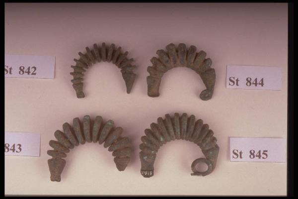 Fibula a grandi coste con decorazione a linee parallele incise sopra la molla