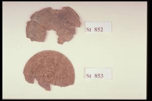 Disco di lamina bronzea decorato a sbalzo da borchiette e file di puntini; cerchi concentrici alternati a file di puntini intorno al foro e inprossimità del bordo