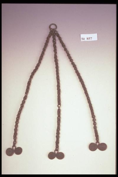 Pendaglio costituito da tre catenelle alle cui estremità sono appesi tre pendagli ad occhiale. Le catenelle sono unite tra loro da un anello di verghetta di sezione biconvessa
