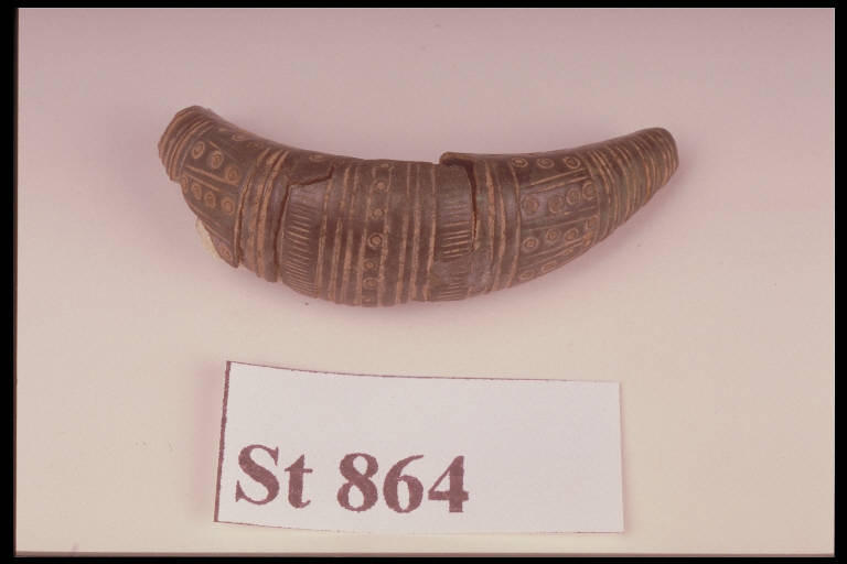 Arco di fibula a sanguisuga con anima in cotto, decorato nella parte inferiore da file di occhi di dado e nella parte superiore da fasci di linee parallele, trattini e occhi di dado