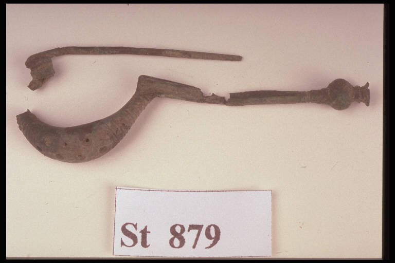 Fibula a sanguisuga con anima in cotto, staffa lunga con globetto a bottone e vaso; parte mediana dell'arco decorata con forellini riempiti di pasta bianca. Sopra la molla e la staffa, decorazione a fasci di linee parallele