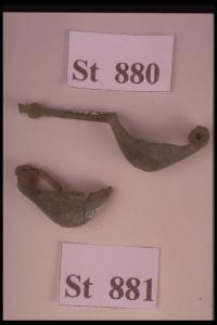 Fibula a navicella con staffa lunga terminante a globetto e appendice troncoconica. Arco decorato da fasci di trattini paralleli perpendicolari fra loro