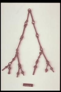 Collana a elementi a forma di 8 allungato, decorata da fasci di linee incise, uniti uno all'altro da un anellino; alle estremità sono appesi pendagli a forma di goccia