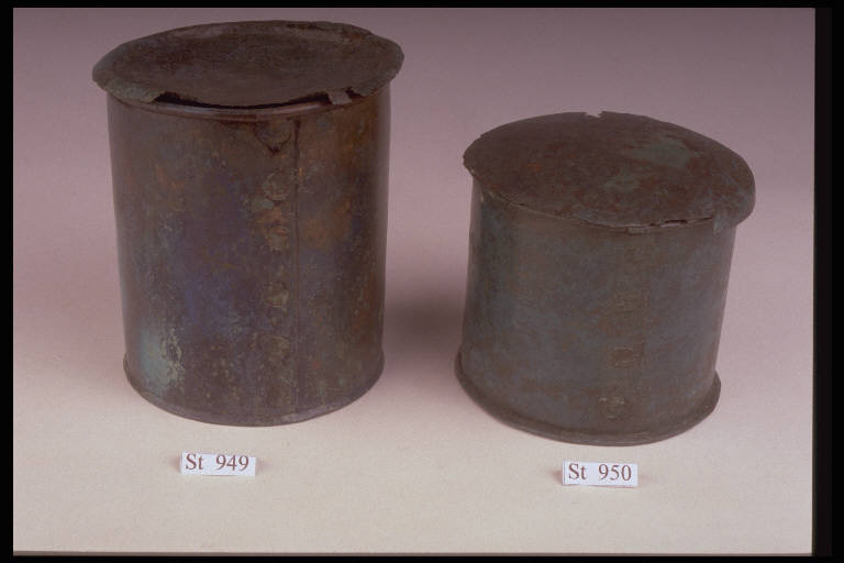 Cista cilindrica in lamina con margini sovrapposti e fissati da 6 ribattini; orlo a cordone arrotolato intorno a una verghetta di ferro; fondo a incastro ribattuto.
