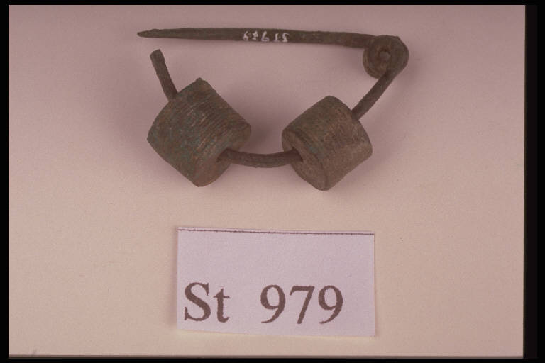 Fibula ad arco composto con arco di verghetta a sezione rettangolare con inseriti due elementi cilindrici di bronzo decorati da linee incise