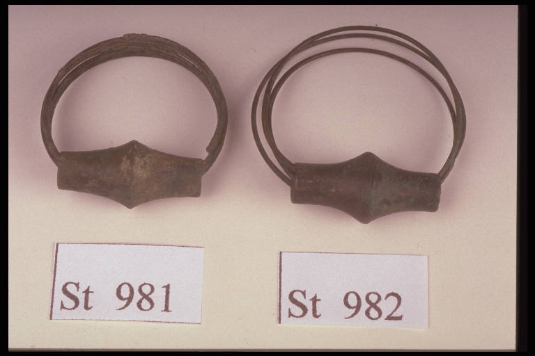 Orecchino in doppio filo di bronzo avvolto a spirale, con perla bitroncoconica a lati inflessi
