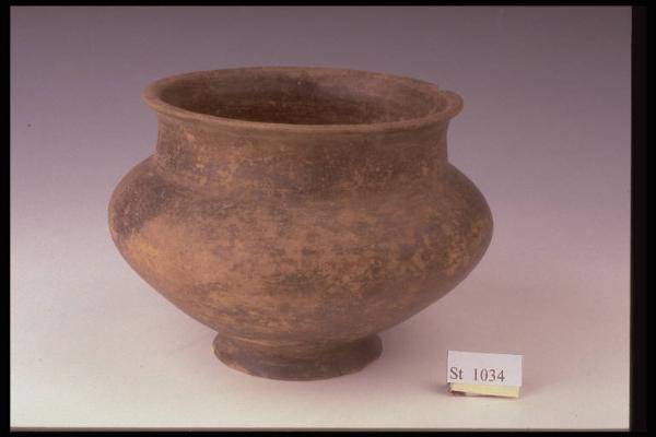 Urna cineraria panciuta, alto collo cilindrico, labbro leggermente esoverso, piede obliquo. Impasto di colore beige con ingubbiatura nerastra sulla superficie esterna e all'interno sul collo. Superficie esterna lisciata a stecca.