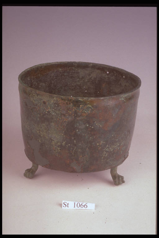Cista a corpo cilindrico con 3 piedi a zampa di leone. Il fondo presenta una larga zona mediana rientrante con al centro un punto incavato. Sotto l'orlo ci sono 4 forellini per l'attaccco delle anse.