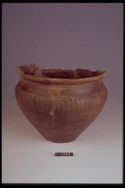 Vaso a corpo troncoconico con breve spalla arrotondata, labbro esoverso. Decorazione a cordicella sotto la gola e sulla spalla. Tacche rettangolari impresse sotto la spalla. Superficie esterna di colore nerastro non uniforme.