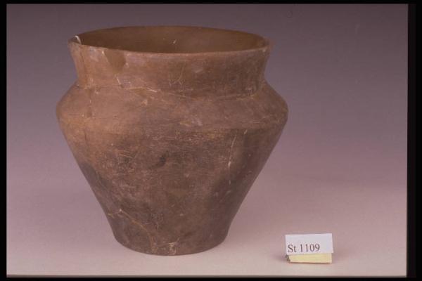 Urna cineraria situliforme con spalla arrotondata, labbro svasato. Superficie di colore nerastro con ampie chiazze beige