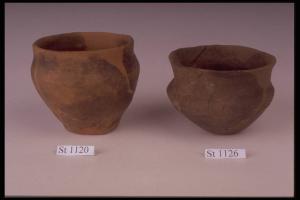 Bicchiere troncoconico con pareti bombate, breve collo cilindrico decorato a ditate sull'orlo. Superficie di colore non omogeneo nocciola nerastro. Sezione grigia con bordi arancio.
