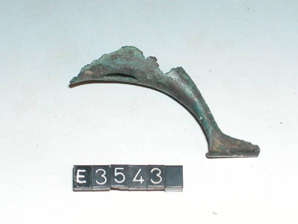 Fibula a sanguisuga con anima in cotto; arco decorato da fasci di trattini trasversali; foro ovale sul ventre