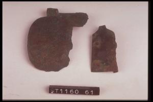 Gancio di cintura con placchetta di forma trapezoidale decorata lungo il bordo e trasversalmente da due file parallele di puntini incisi.