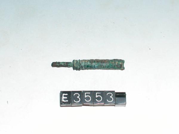 Elemento cilindrico cavo internamente, decorato da fasci di linee parallele; in un capo è inserita una piccola verghetta a sezione circolare.