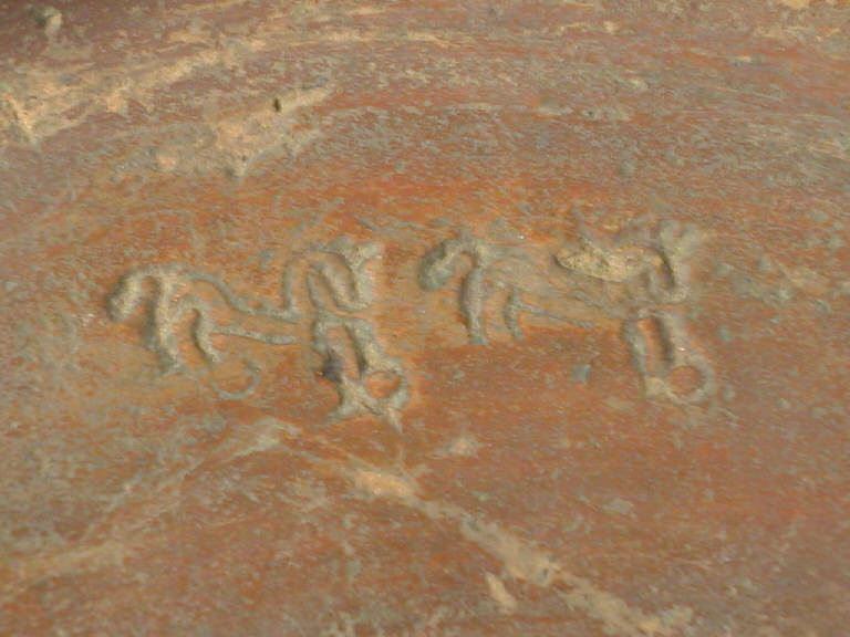 Patera su basso piede ad anello, orlo appena rientrante. Sulla superficie interna, vicino all'orlo, sono impressi due cavallini, sul fondo esterno due lettere graffite in alfabeto nord-etrusco. Superficie interna verniciata di rosso.