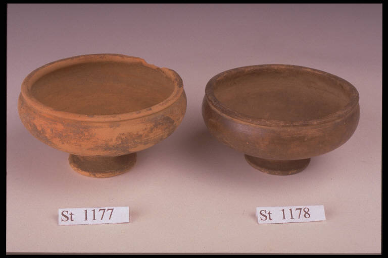Coppetta su basso piede con piccola gola sotto l'orlo. Impasto di colore giallastro, coperto da stralucido marrone a reticolo su fondo grigiastro.