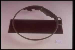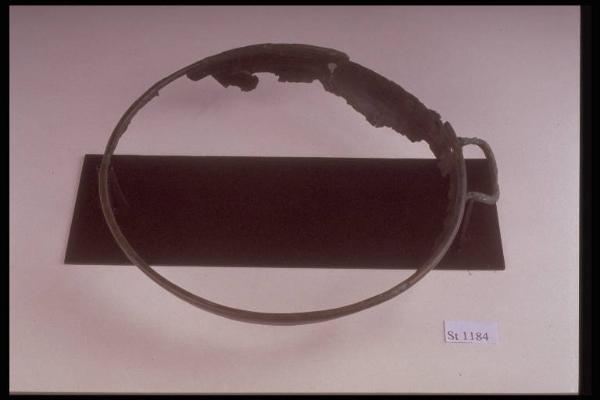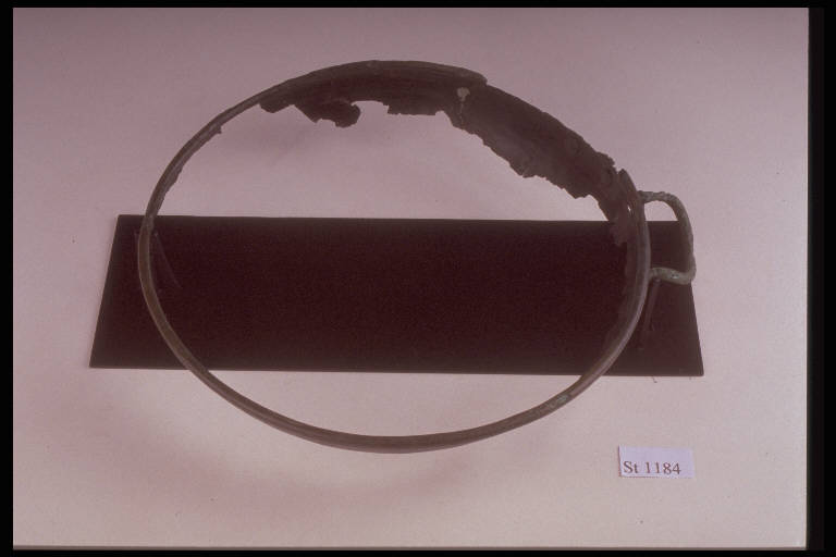 Bacile di lamina, con orlo avvolto intorno a una verghetta di ferro a sezione circolare; ansa orizzontale fissata sotto l'orlo da due piastrine di forma allungata, provviste di due ribattini.