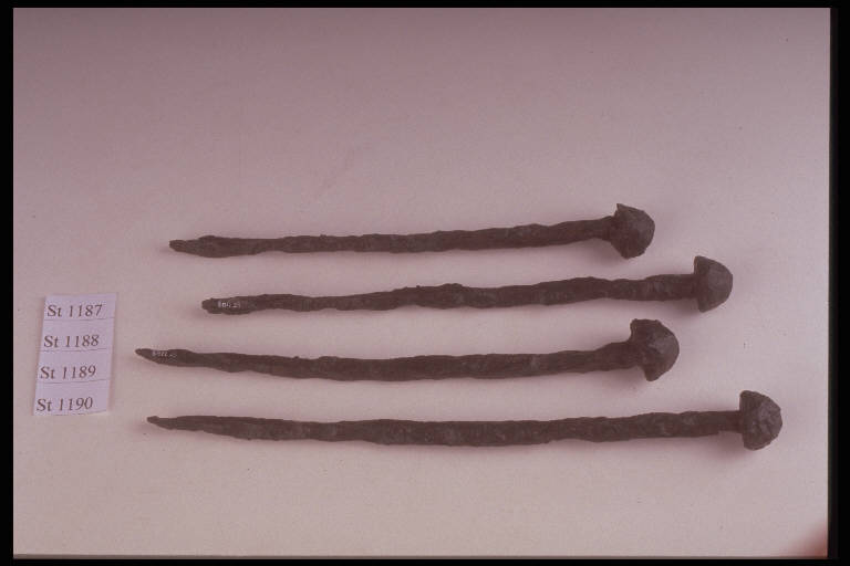 Chiodo a grossa capocchia convessa, gambo a sezione dapprima circolare e poi quadrangolare.