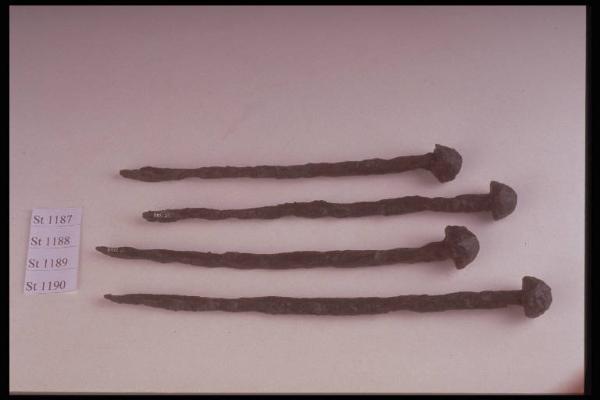 Chiodo a grossa capocchia convessa, gambo a sezione dapprima circolare e poi quadrangolare.