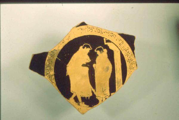 Kylix a figure rosse. Impasto di colore rosato, superficie ricoperta da vernice nera intensa e brillante. Il medaglione centrale, contornato da fasce a meandro, rappresenta due figure ammantate in colloquio; su un lato una colonna dorica.