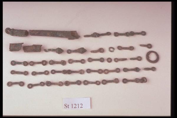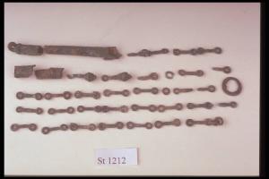Catenella con pendagli in frammenti, di cui rimangono 29 elementi a forma di 8 allungato. Due pendagli a melograno, 4 frammenti di pendagli di forma quasi cilindrica, cavi internamente, un anello di verghetta a sezione quadrangolare.