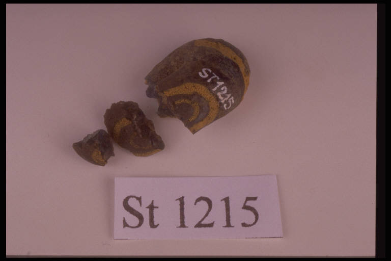 Perlina di pasta vitrea azzurra, decorata da cerchi concentrici gialli