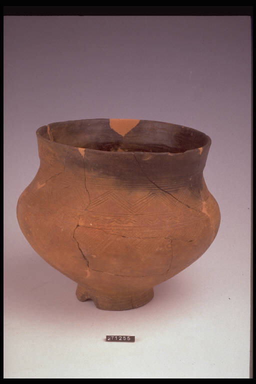 Urna con ampia bocca senza labbro, alto collo leggermente svasato, piede obliquo. Decorazione incisa a fasce di linee parallele e zig-zag nella parte superiore e denti di lupo e cordicella con coppelle al vertice inferiore, alternati a cinque coppelle disposte a croce in corrispondenza del diametro massimo. Piede decorato a cordicella. Colore non omogeneo nerastro nocciola.