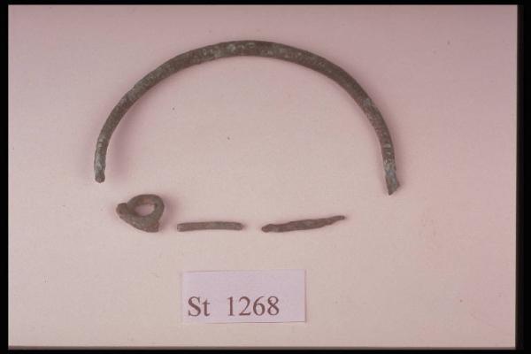 Fibula ad arco semplice con decorazione incisa a spirale.