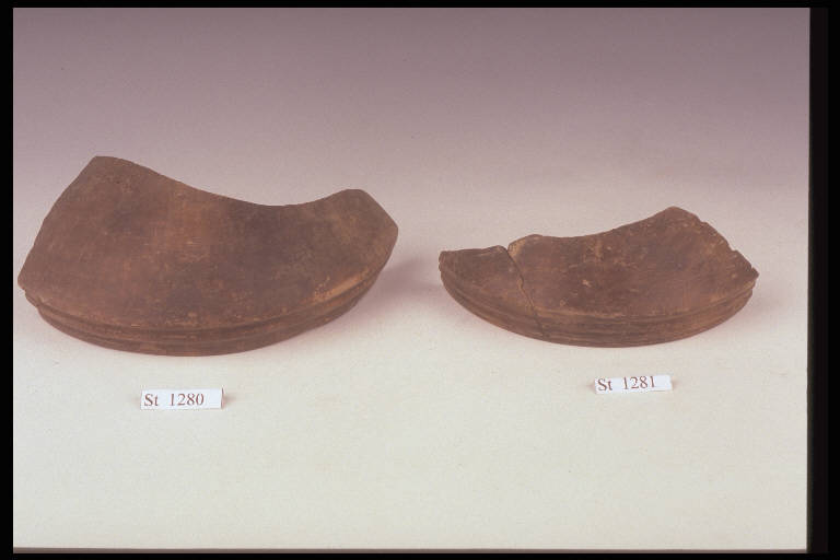Grande coppa a corpo troncoconico, labbro rientrante con quattro costolature alternate e tre solcature. Superficie esterna nerastra, frattura nera con piccoli margini nocciola.