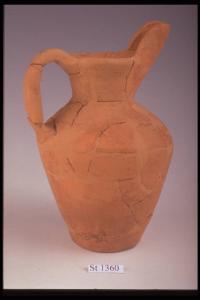 Brocca a becco rialzato tipo Schnabelkanne, ansa a nastro subrettangolare impostata su orlo e spalla. Colore arancio.