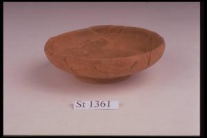 Ciotolina su basso piede obliquo. Impasto bruno con tracce di vernice rossastra sulla superficie esterna.
