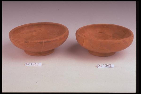 Ciotola a orlo appena rientrante su basso piede obliquo. Impasto arancio; vernice rossastra sulla superficie esterna.