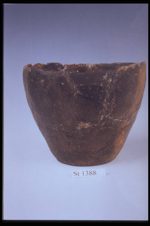 Parte inferiore di vaso ovaleggiante, fondo concavo. Colore non uniforme nerastro con chiazze nocciola.