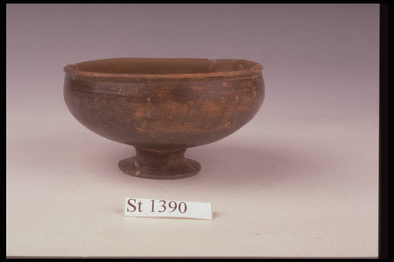 Coppetta a medio piede svasato a tromba, orlo distinto; sotto l'orlo e sopra il piede due fasce nere; decorazione a stralucido nero e reticolo sul corpo. Impasto colore arancio.
