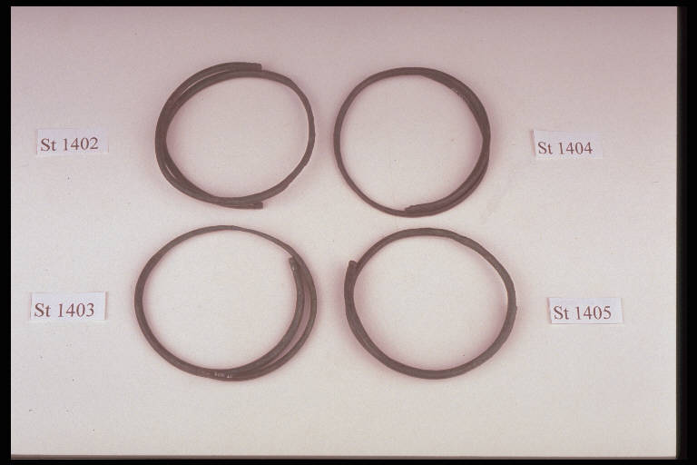 Armilla a capi sovrapposti di verghetta di bronzo a sezione circolare che verso le estremità diventa rettangolare. Le estremità presentano due globetti profilati preceduti da un tratto decorato a fitte linee parallele incise.