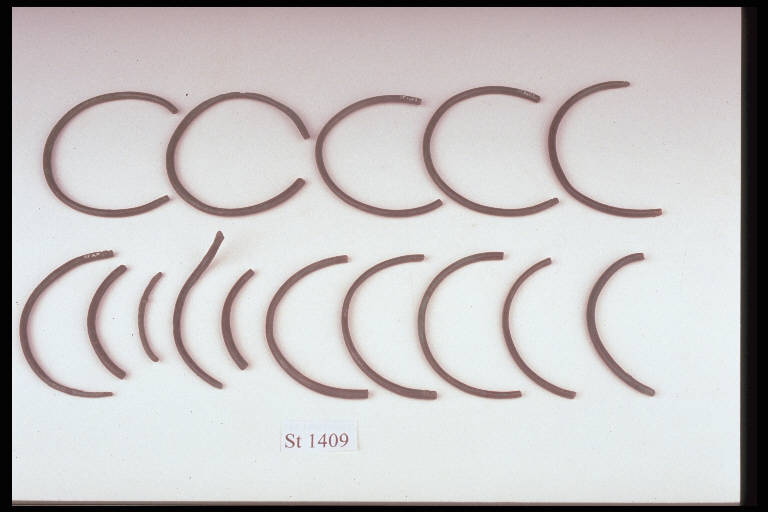 Armilla a capi sovrapposti di verghetta di bronzo a sezione circolare che verso le estremità diventa rettangolare. Le estremità presentano due globetti profilati preceduti da un tratto decorato a fitte linee parallele incise.