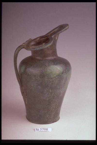 Schnabelkanne con corpo piuttosto basso, ampia spalla arrotondata, fondo appena svasato, ansa a sezione subellittica decorata da due file di perline. La placchetta dell'attacco inferiore dell'ansa è costiutita da motivi fitomorfi e S rovesciate. Corpo decorato a incisione: un fascio di palmette alternate a fiori di loto sopra il piede; un fascio di boccioli alternati a palemtte e, sopra, uno di ovoli e archetti sul collo. Il bordo piatto dell'imboccatura è decorato da 3 file di perline e, negli angoli interni, da due cavalli.